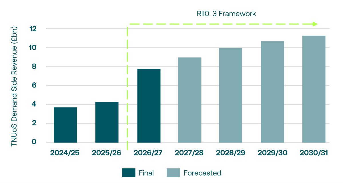 According to the latest tariffs from NESO, demand-side residual revenue will reach £7.52 billion in 2026/27, almost double the 2025/26 level and £3.86 billion higher than earlier forecasts. Further increases are also forecasted through to 2030-31 through the RIIO-3 framework. RIIO-3 (Revenue = Incentives + Innovation + Outputs) determines the revenue allowed for network companies.